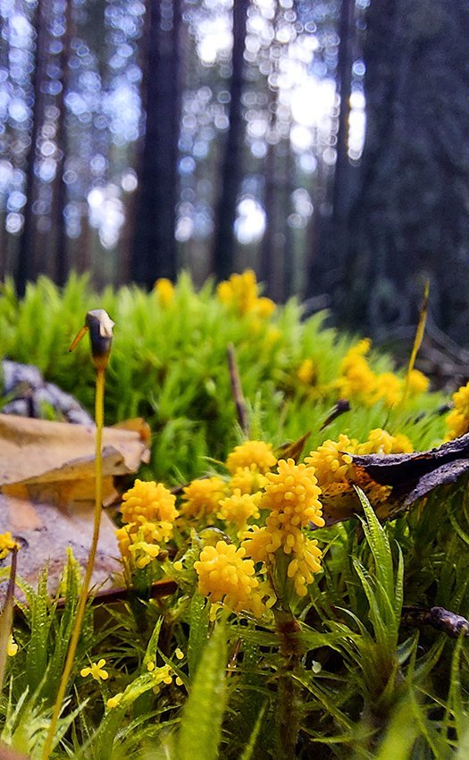 А вот другой миксомицет. Бросается в глаза другой цвет и не столь выраженные "плодовые тела" (спорангии? псевдоэталии?).